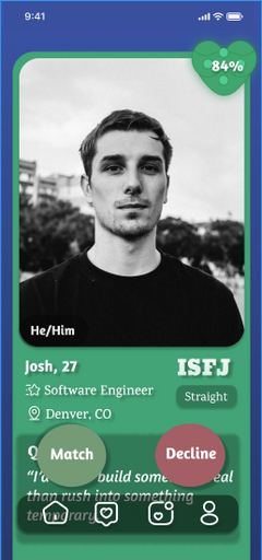 Quirk is a personality-driven dating app concept designed to help emerging adults form connections based on compatibility rather than appearance. Using the Myers-Briggs Type Indicator (MBTI), the app introduces personality insights and match percentages to encourage more meaningful interactions.